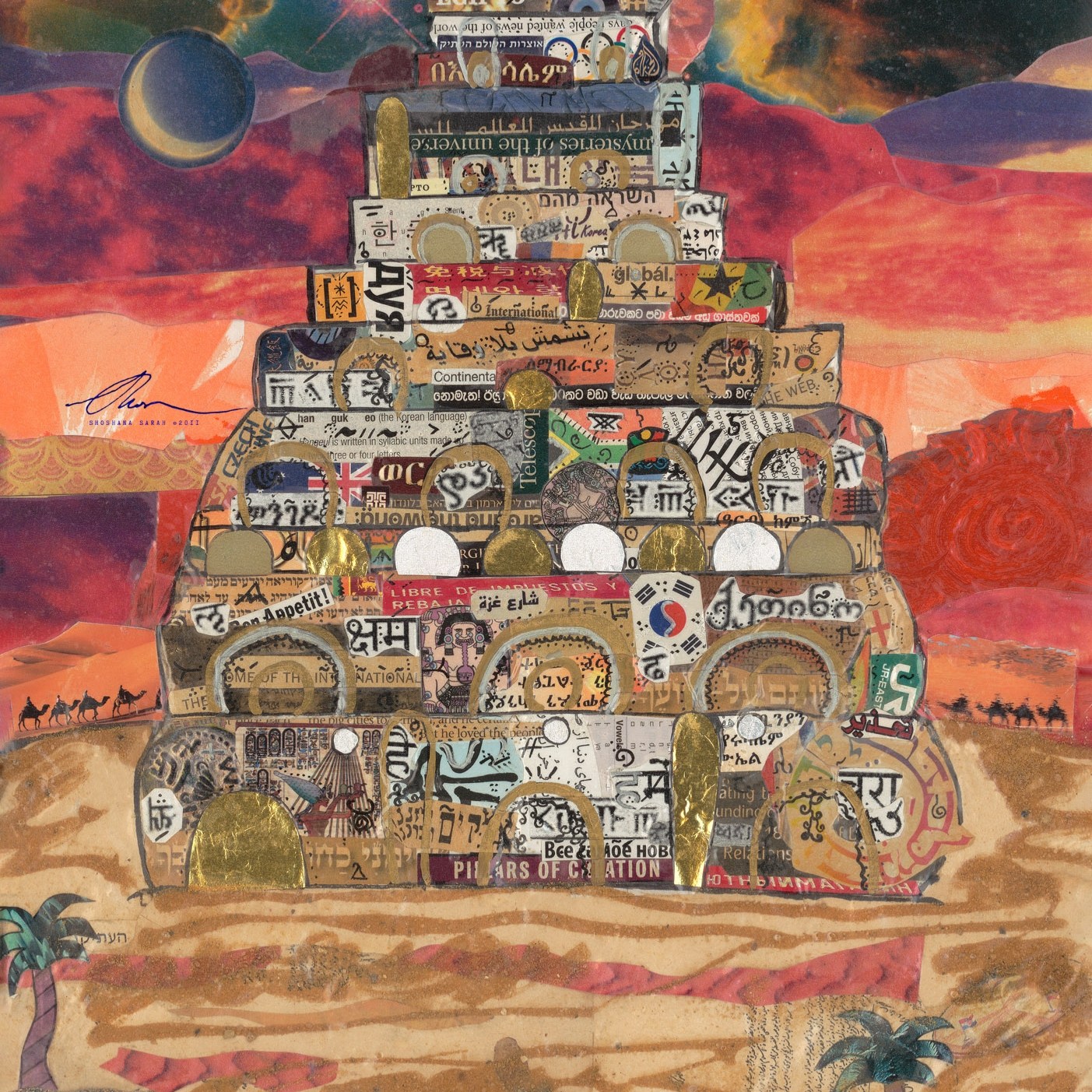 I wanted the languages I found to really be found. The collage includes 20 languages: Amharic, Arabic, Celtic, Chinese, Cuneiform (some of which I sketched on top of the collage), English, French, Georgian, Greek, ancient Hebrew, modern Hebrew, Hieroglyphics (my pride & joy), Hindi, Japanese, Korean, Persian (gifted by a friend for the task), Russian, Sanskrit, Spanish, and what I am 95% sure is Thai (from a post office flyer that clearly wasn’t for me).