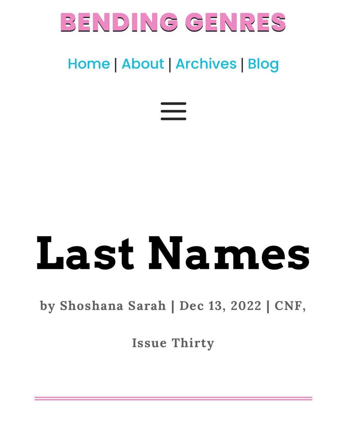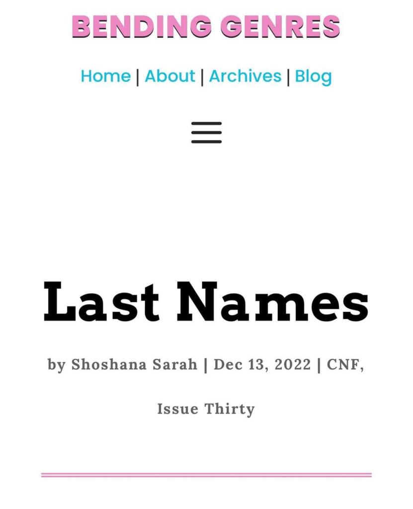 “Last Names,” Bending Genres, Issue 30, Dec 13, 2022.