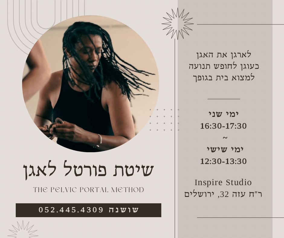 האגן הוא מרכז הגוף. שיטת פורטל לאגן, מאת אורלי פורטל, היא שיטה ייחודית שמארגנת את האגן כעוגן לחופש תנועה דרך תרגול מעמיק מדיטטיבי ותנועות ממסורות העתיקות צפון אפריקאיות החוגגות את האגן. להניח משקל, לתת מקום לבטן, לרכוב את הקצב, לפתוח שער, למצוא בית בגופך. אפשר לקרוא יותר על השיטה כאן.